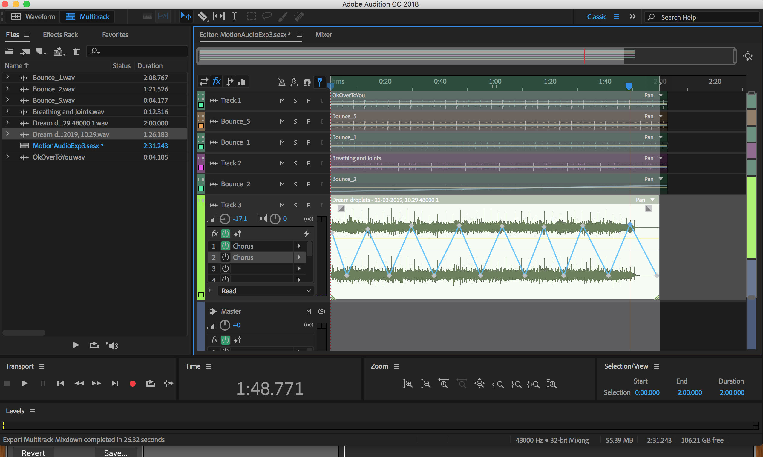 I also worked with a number of the birdsong/forest recordings that we had in Audition to remove the wind and road noise (and a fighter jet at one point) as much as possible.